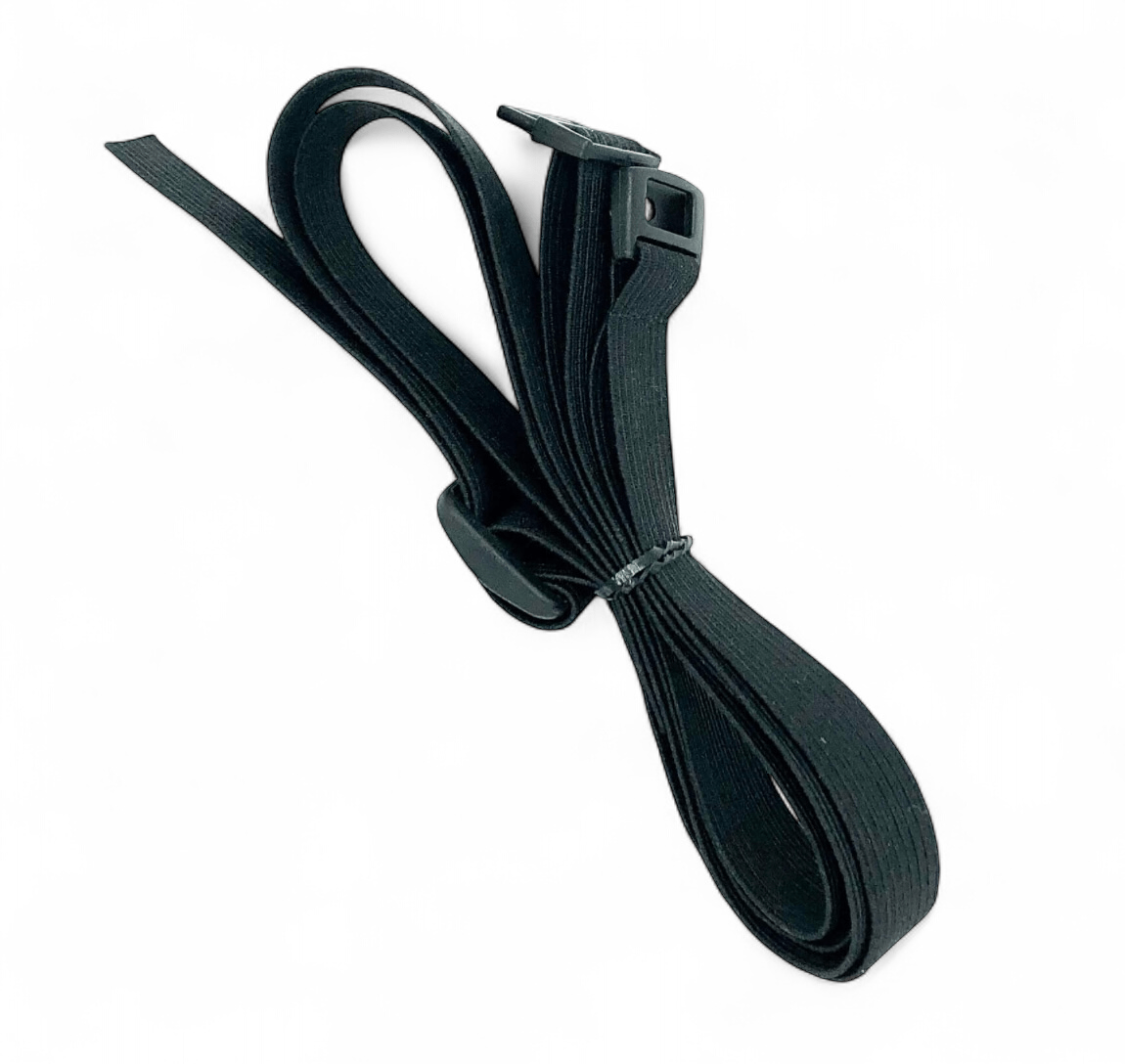 System includes three sets of wafer clips along each side of the quilt, a TWO (2) continuous 1/2” elastic strap loop with wafer clip connections, and a single 1/2″ elastic flat strap. If your quilt is wide enough to fully encircle you the wafer clips on the quilt can be fastened together to close the back of the quilt. Or the wafer clips on the quilt can be fastened to the continuous loop ½” elastic strap placed around your pad and the 1/2″ elastic flat strap placed under the user to provide an effective functional connection.