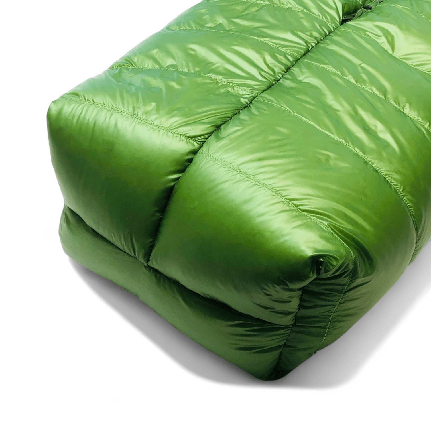The down-filled chambers on the torso section of the OUTLAW Quilts run vertically (top to bottom), providing exceptional drape, which means that the quilt will lie close to your body, resulting in better thermal performance. Gaps between your body and the inside of the quilt are hard for your body to heat; the efficient draping of the OUTLAW eliminates almost all of this dead air. The chamber design of the OUTLAW’s foot box allows for a variety of options with a snug, efficient fit.