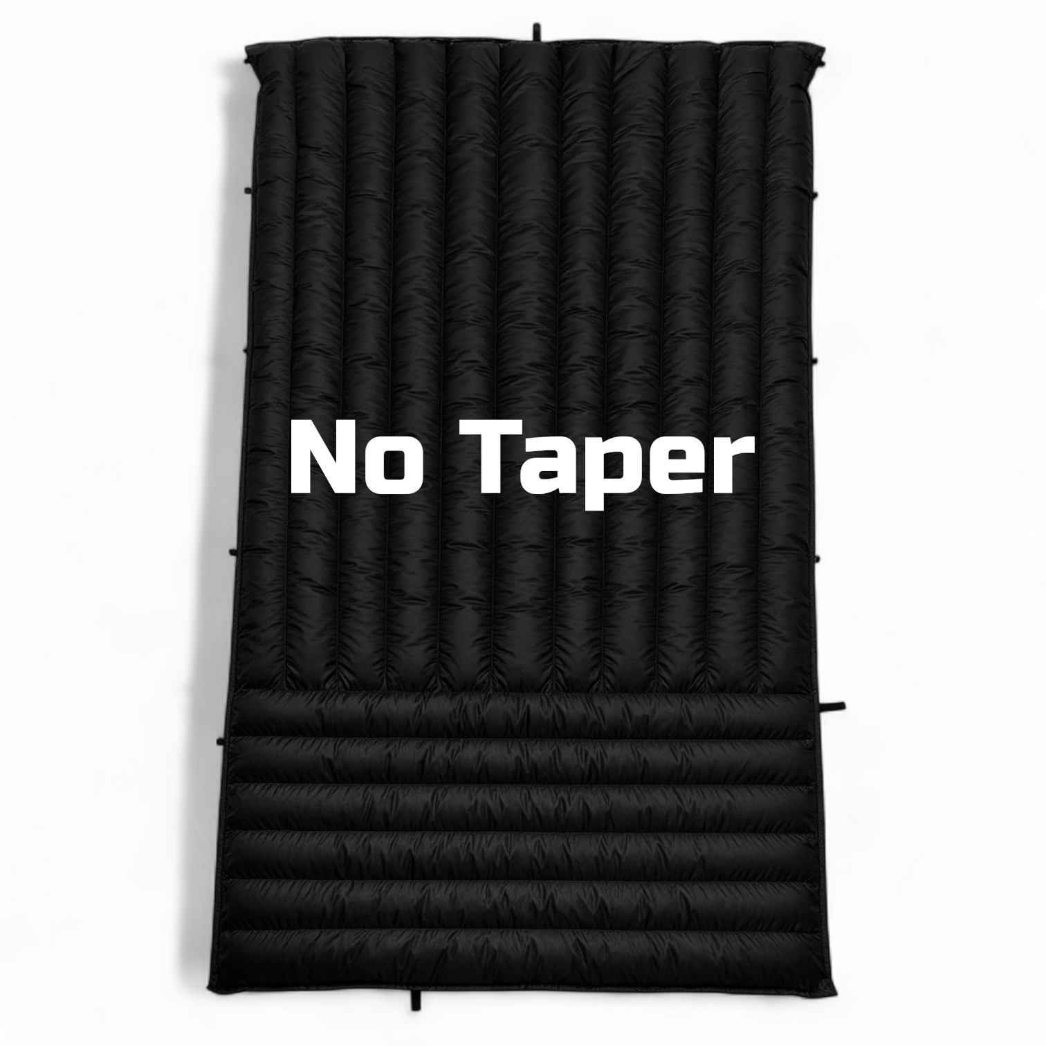 No-Taper: When fully opened and lying flat, this shape forms a rectangle, with the head and foot ends being equal. The advantage of this style is that it provides maximum coverage and maximum foot box space, but at the disadvantages of increased weight and slight loss of thermal efficiency. This option also includes additional down as need to offset for the increased quilt volume to maintain temp rating.