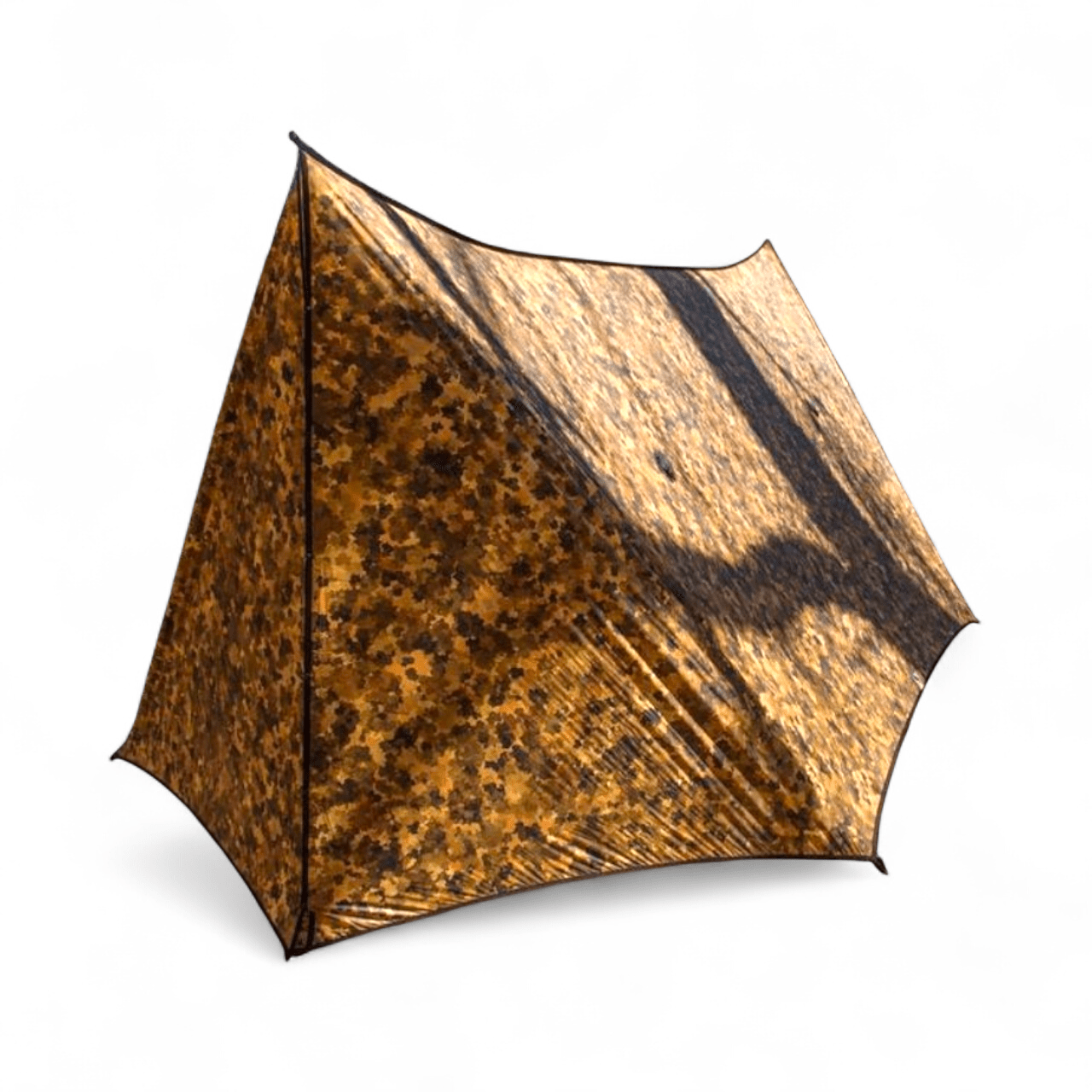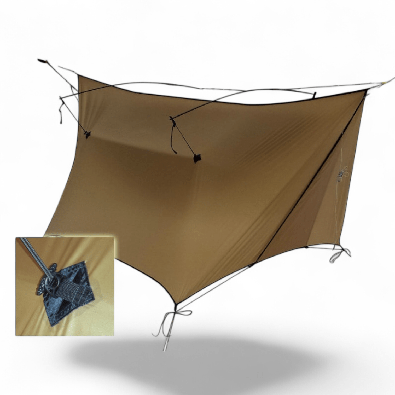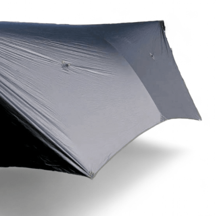 Constructed from a super low stretch 1.1/oz 20d Sil/PU coated Ripstop Polyester. Polyester based fabrics have much less stretch than traditionally used nylon based fabrics. This means your tarp will stay taut throughout the night, performing more efficiently than a nylon based tarp would. Sil/PU Polyester also has the advantage of naturally repelling water, resulting in your tarp being much lighter when wet and pack up much smaller as it will not absorb water like a traditional Silnylon will.